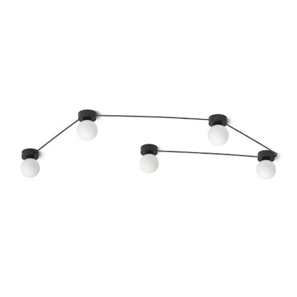 Tag- eller væglamper med glasskærme på sortlakerede baser, tilsluttet på række med sorte kabler. Armaturerne kan arrangeres i grupper efter din fantasi. Velegnede til LED-lyskilder med G9-fatning.