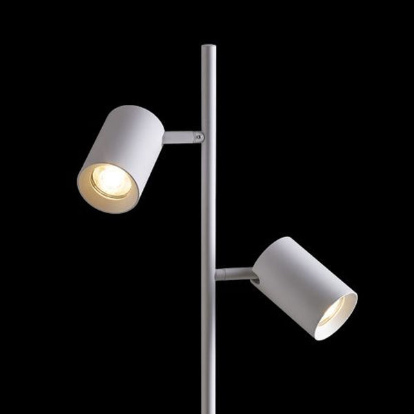 Kromfarvet gulvlampe med to justerbare sorte LED reflektorer. Enhver lyskilde kan styres separat med hver sin afbryder. To røde tekstilledninger med hver sit stik.