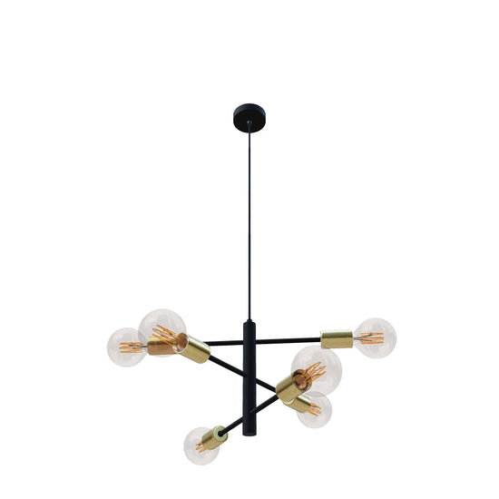 Designet pendel med dekorative messingcylindere til fatninger. Armaturen kan formes ved at justere armene på den horisontale akse. Velegnet til LED-lyskilder med E27-fatning.