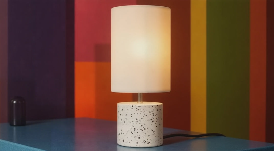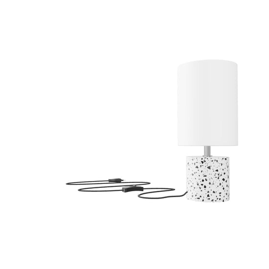 Minimalistisk cylinderformet bordlampe med tekstilskærm. Hver base har en unik finish.