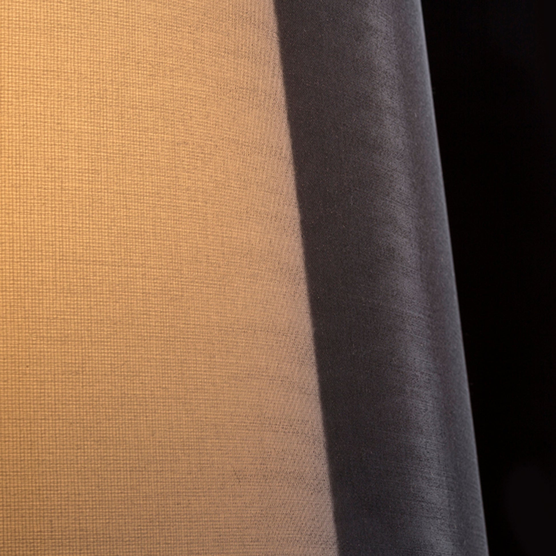 Bordlampe med dobbelt tekstilskærm og teleskopstang der kan justeres i højden.