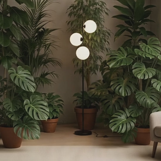 Standerlampe med tre lampeskærme i opalglas på sortlakeret base. Velegnet til LED lyskilder G9.