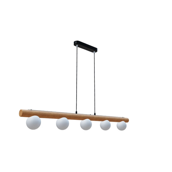 Pendellampe med fem opalfarvede glasskærme monteret på en træbase. Takbasen er lavet af lakeret metal.