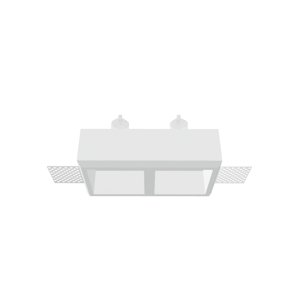 Firkantet indbygget trimless spot af gips med to lyskilder. Kan males med almindelig vægmaling. Kun for gipslofter.