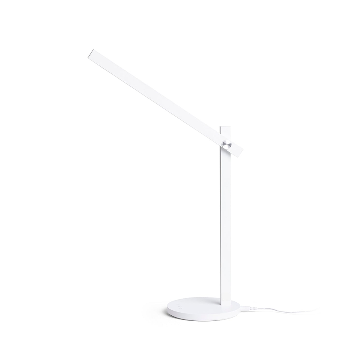 Elegant slank LED-skrivebordslampe med justerbar lysstyrke og farvetemperatur, der styres via basen.