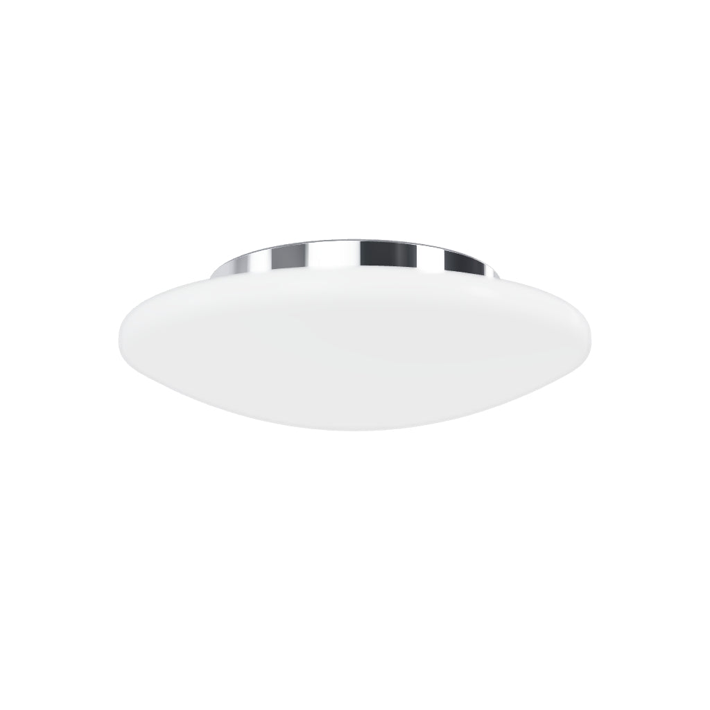 LED-loftslampe af opalfarvet glas med en base af krom. Velegnet til våderum.