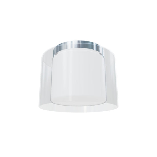 Loftlampe med en kombineret skærm, der består af udvendigt klart glas og indvendigt opalfarvet glas, med en base af krom med en E27-fatning til LED-lyskilder. Velegnet til badeværelser.