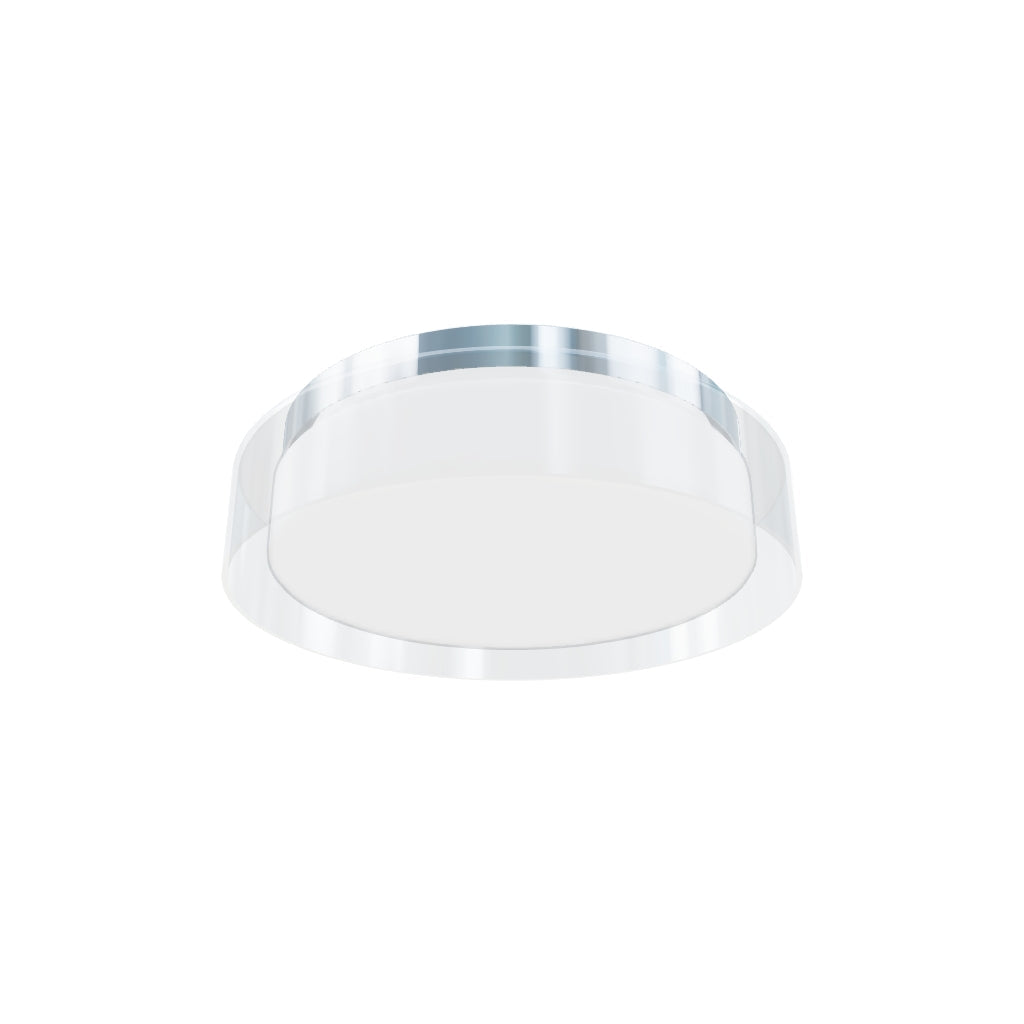 Loftlampe med en kombineret skærm, der består af udvendigt klart glas og indvendigt opalfarvet glas, med en base af krom med inbygget LED. Velegnet til badeværelser.