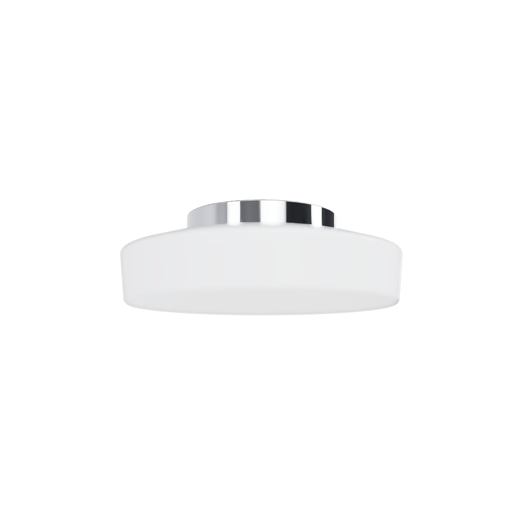 LED-loftslampe af opalfarvet glas med en base af krom. Velegnet til brug i badeværelser.